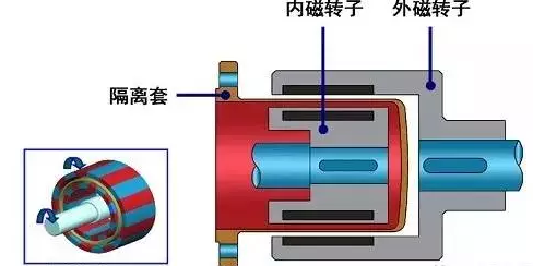 在采用金屬隔離套時,隔離套處于一個正弦交變的磁場中,在垂直于磁力線方向的截面上感應出渦電流并轉化成熱量。渦流的表達式為:。其中Pe-渦流;K—常數;n—泵的額定轉速;T-磁傳動力矩;F-隔套內的壓力;D-隔套內徑;一材料的電阻率;—材料的抗拉強度。當泵設計好后,n、T是工況給定的,要降低渦流只能從F、D、、等方面考慮。選用高電阻率、高強度的非金屬材料制作隔離套,在降低渦流方面效果十分明顯。