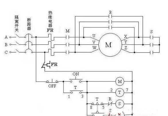 R接觸器,為啟動之后,把電機繞組首尾連接起來。即U-Z,Y-W,X-V三個繞組的三角形接法。 T時間繼電器,起動時,比如要讓電機在5秒內完成起動進入正常運轉狀態,就可把時間繼電器設定到5秒