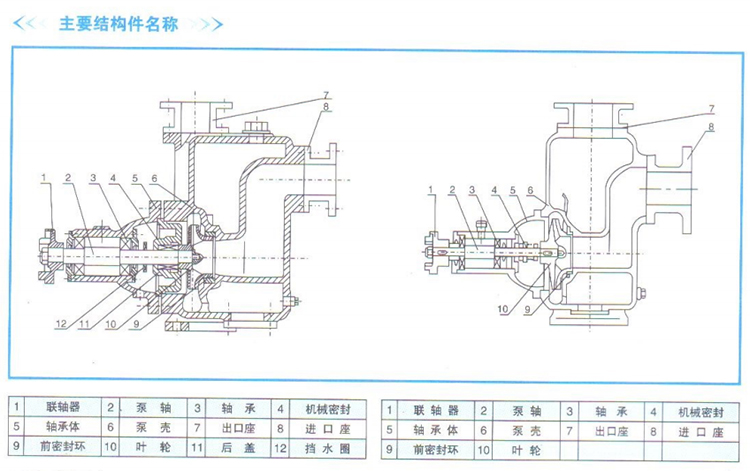 在一些泵的軸承體底部還設(shè)有冷卻室。當(dāng)軸承發(fā)熱引起軸承體溫升超過70度時(shí),可在冷卻室處通過任意一只冷卻液管接頭,注人冷卻液循環(huán)冷卻。泵內(nèi)部防止液體 由高壓區(qū)向低壓區(qū)泄漏的密封機(jī)構(gòu)是前后密封環(huán),前密封環(huán)裝在泵體上,后密封環(huán)裝在軸承體上,當(dāng)泵經(jīng)長(zhǎng)期運(yùn)轉(zhuǎn)密封環(huán)磨損到一定程度,并影響到水泵的效率及自 吸性能,應(yīng)給予更換.